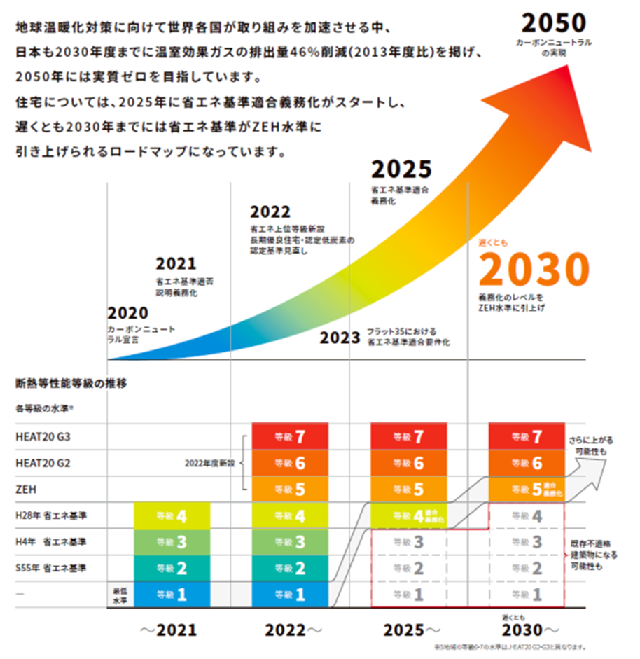 カーボンニュートラル社会(脱炭素社会)が実現している頃、日本の住宅基準は今とは比較にならないほど厳しくなっています。
